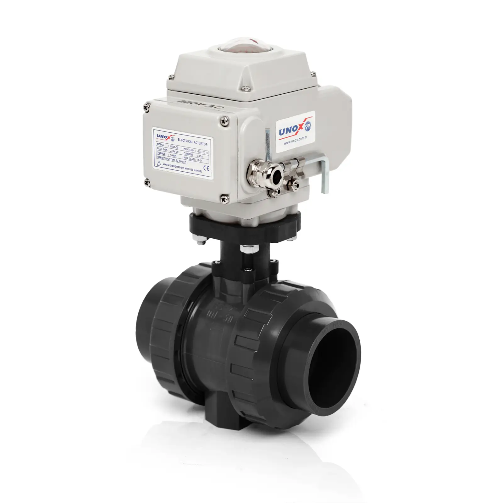 Since these valves are manufactured from U-PVC material, they exhibit high chemical resistance. The electric motor is available in 24V DC or 220V AC options. In addition, they feature an IP65 protection class and can be safely used in outdoor environments. The body design provides maximum sealing performance, and high-quality seals are used to ensure long service life.